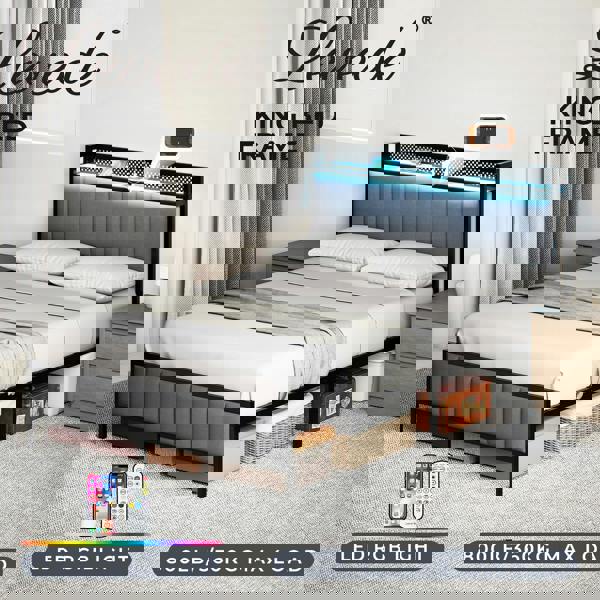 The King size LED bed frame with USB and Type-C charging ports makes it easy to power your devices overnight without messy cables. The padded headboard offers a comfortable backrest for reading gaming or streaming while the reinforced steel slats provide strong mattress support removing the need for a box spring. With generous under-bed storage clearance this upholstered LED King bed frame with storage is ideal for keeping your room neat and clutter-free.