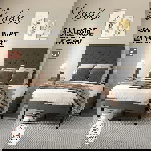 Levede Upholstered Bed Frame delivers a modern elegant and supportive sleep solution for UK homes. Designed with a sturdy MDF and plywood structure high-density 18D foam and soft linen fabric this bed frame brings comfort durability and contemporary style to any bedroom. The tufted headboard offers excellent back support for reading or relaxing while the raised legs provide easy access for robot vacuums. Our small double bed frame is perfect for modern apartments guest rooms and master bedrooms.