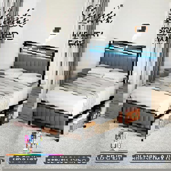 The LED bed with USB ports and Type-C charging port ensures your devices stay powered overnight eliminating messy extension cords. A soft padded headboard provides comfort while reading or relaxing while the sturdy steel frame with slatted base offers reliable mattress support without the need for a box spring. Perfect as a double bed frame with storage space underneath this design combines durability style and smart technology for modern living.