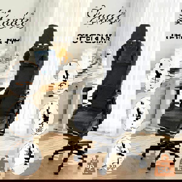 Upgrade your workspace comfort with this ergonomic reclining office chair. Featuring a durable metal frame high-density foam and soft faux suede fabric it delivers lasting support and style. The adjustable backrest reclines from 90° to 135° perfect for working reading or relaxing. The built-in spring seat cushion ensures plush comfort while the retractable footrest and 2D armrests offer added relaxation. Height adjustment and a movable lumbar support allow you to find the ideal posture. With 360° swivel movement smooth PP caster wheels and a sturdy Class-3 gas lift this chair supports up to 150kg. Ideal for home or office use combining durability flexibility and modern comfort.