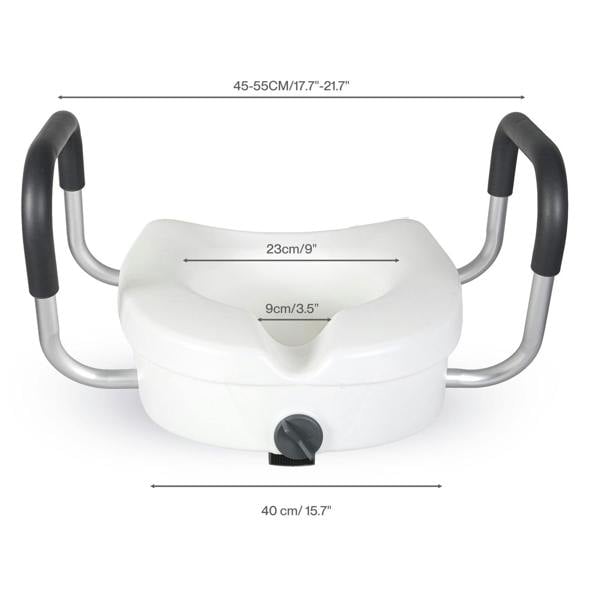 Constructed with an anodised aluminium frame HDPE seat and PU foam armrests this raised toilet seat offers durability hygiene and comfort. The adjustable armrests (45–55cm width) provide customised support while the tool-free installation system with hand-tightening knobs and locking clips ensures quick and secure setup.