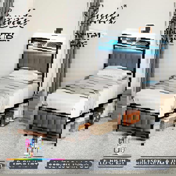 The Single LED bed frame with USB and Type-C charging ports makes it easy to power your devices overnight without messy cables. The padded headboard offers a comfortable backrest for reading gaming or streaming while the reinforced steel slats provide strong mattress support removing the need for a box spring. With generous under-bed storage clearance this upholstered LED Single bed frame with storage is ideal for keeping your room neat and clutter-free.