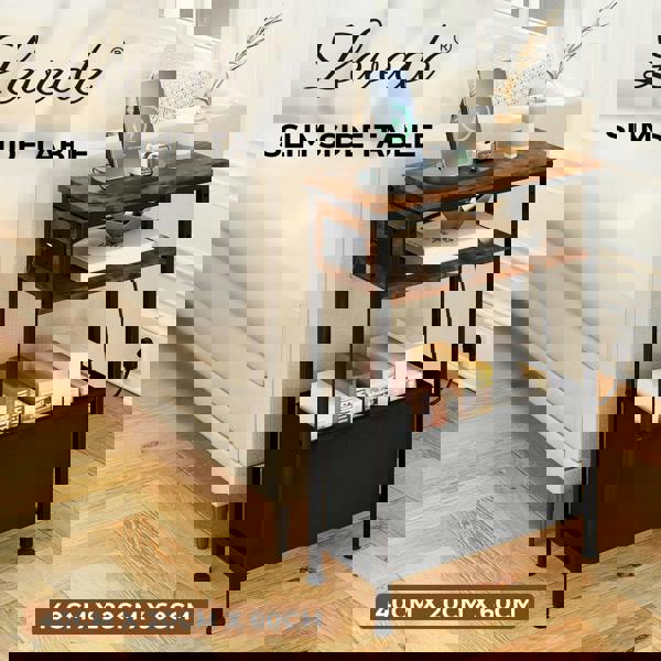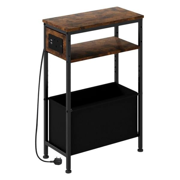 Upgrade your home with this Levede narrow side table with charging station featuring a vintage brown engineered wood top and a sturdy black metal frame. Designed as a compact side table and end table its slim 20cm depth makes it ideal for small spaces fitting perfectly beside sofas beds or in tight corners while adding a modern industrial look to living rooms and bedrooms.