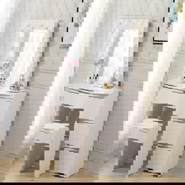 Featuring a smooth sliding drawer and generous storage space this levede makeup table with mirror and drawers ensures all your cosmetics and accessories stay organised. The included PU padded stool is waterproof tear-resistant and easy to clean delivering both comfort and practicality. Perfect for bedrooms apartments or a stylish beauty corner this white vanity desk with lights combines elegance and function. With simple instructions the dressing table set with mirror and stool is quick to assemble making it a wonderful upgrade for your bedroom furniture or a thoughtful gift for her.