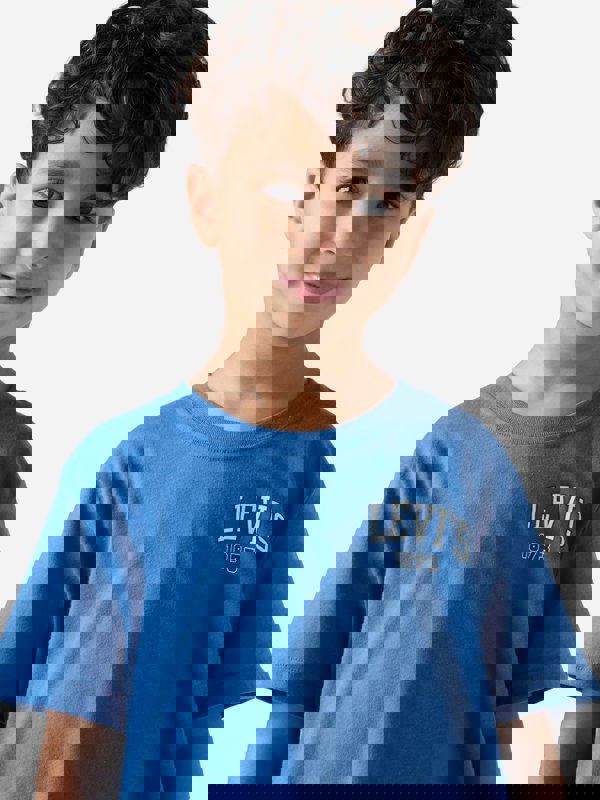 This Levi’s boys t-shirt comes in star sapphire blue with a bold text print in white and black. A round neckline and short sleeves keep the shape classic, finished with a straight hem for a clean outline.