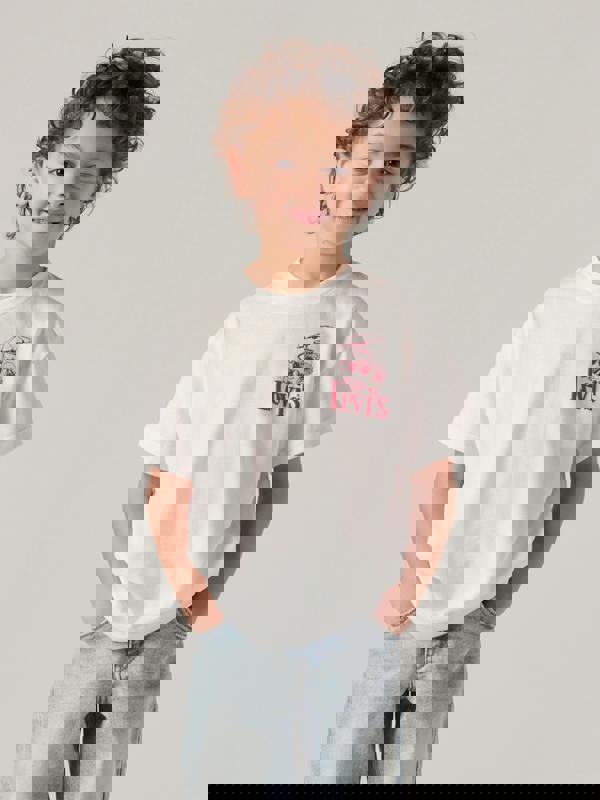 This Levi’s boys T-shirt comes in bright white with a fun red logo print on the left chest and a larger print across the back. It has a classic cut with short sleeves, finished with a round throat and ribbed trim for a clean, simple look.