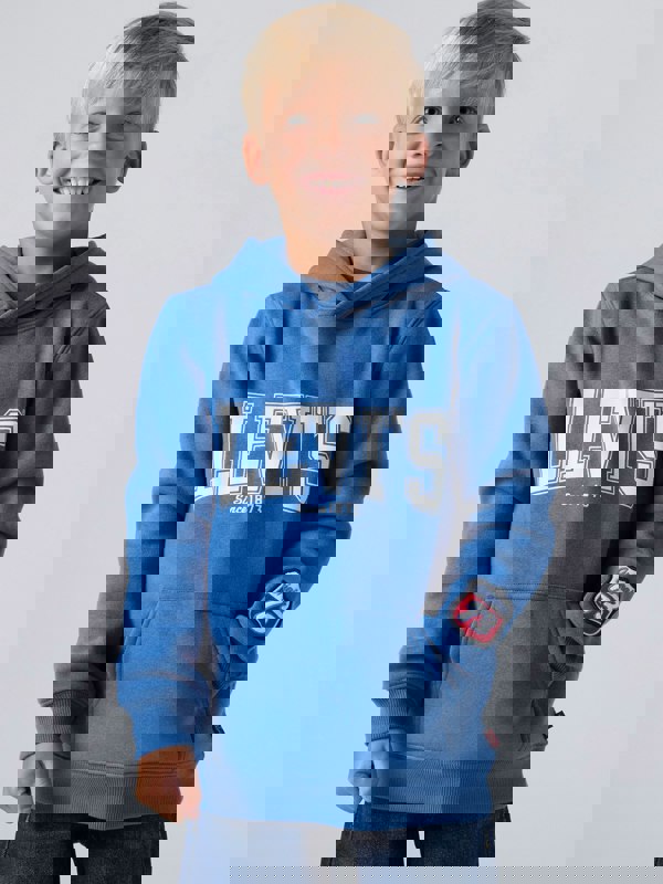 This Levi’s boys hoodie comes in blue with a classic white logo print on the front. A “73” embroidery detail adds extra branding, while the kangaroo pocket keeps the front clean and practical.