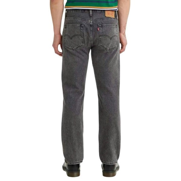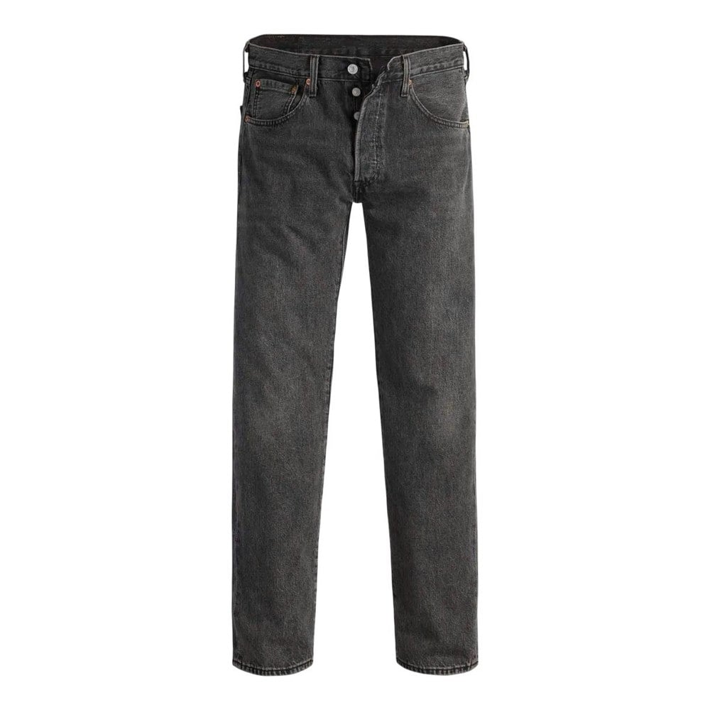 Levis Mens 501 93 Straight Jeans in black with a plain design and straight fit. The construction includes multiple pockets for everyday wear, with rivet detailing and a coin pocket. A leather patch adds a classic finishing detail.