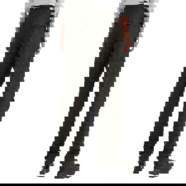 The mid-rise waist includes a drawstring and belt loops, with a button fastening and zip fly at the front. Storage is provided by two side pockets and two back pockets, with buttoned flap closures. A branded tab completes the look.
