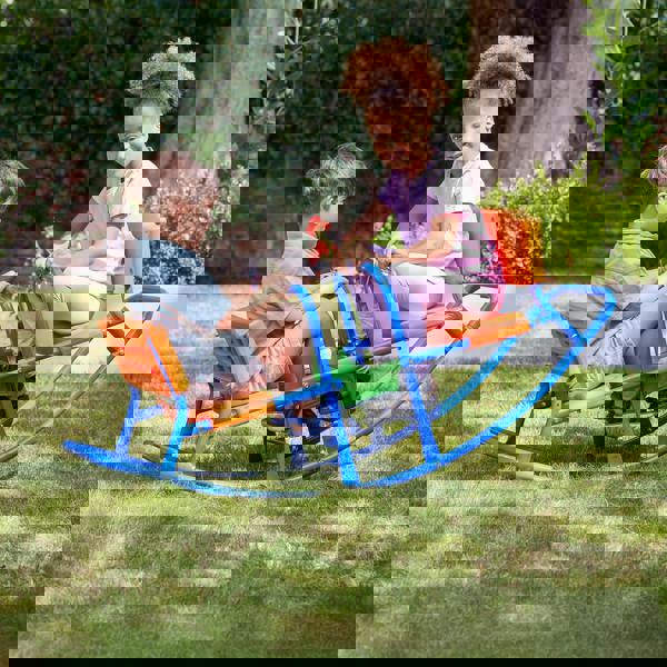 Bright plastic seats and easy-grip handholds are paired with a sturdy, rust-resistant powder coated steel frame for confident play. At the centre, a waterproof fabric tray adds an extra sensory dimension, offering a practical space for toys, natural finds, or small world play items, extending the experience beyond the rocking motion. Supplied flat packed for simple assembly, it makes a considered addition to a garden or play area for domestic use.