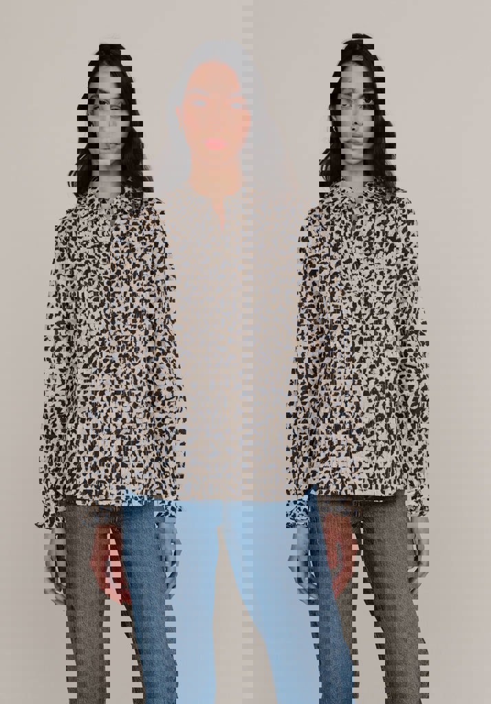 A move on from our classic shirt, the lightweight Emeline features our vintage animal archive print, re-coloured in a lighter, dusty cream and printed onto a cotton/linen blend for the first time. Styled with a small frill collar, self-covered buttons and pintuck detailing on the front.
