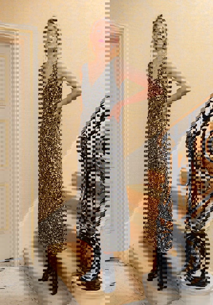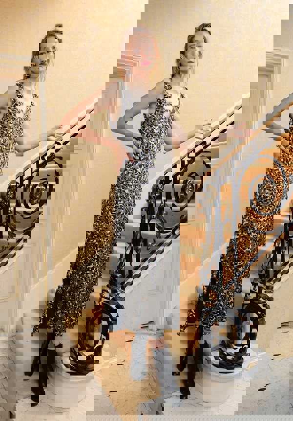 A new dress shape, the Estee comes in our Khaki cat print, printed onto satin.