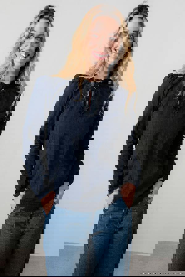 Texture and delicate trim bring a refined finish to the Lily & Me Emily Organic Cotton Check Keyhole Blouse. Cut from textured check woven organic cotton, this navy style is detailed with a keyhole neckline and a scalloped mandarin collar, fastened with a nickel free metal button. Pointelle trim frames the collar and neck opening for a considered look.
