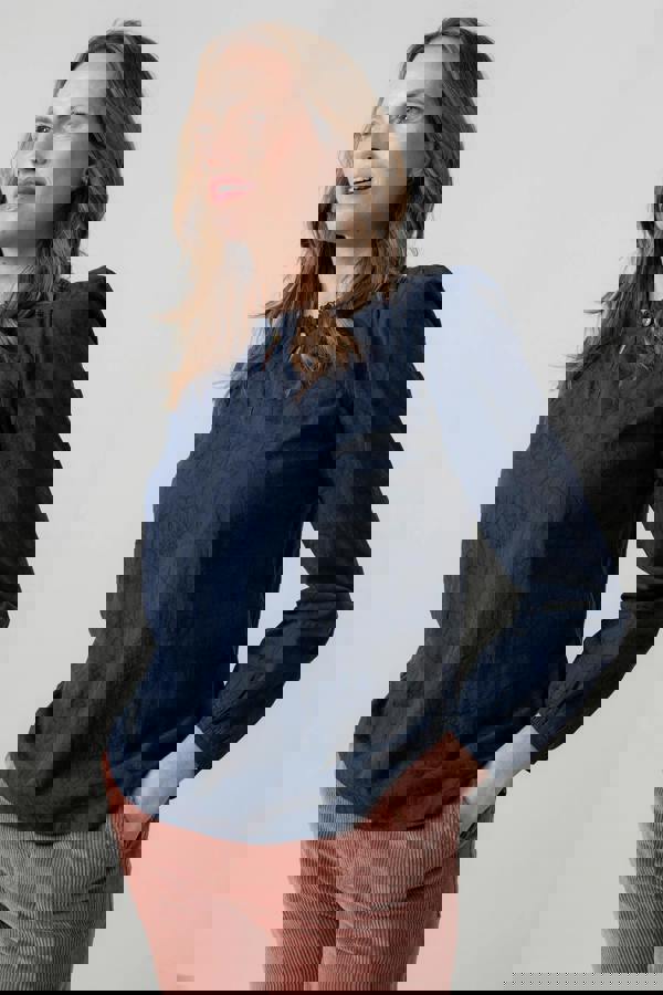 Gathering at the front shoulders and sleeve head adds soft structure, while long sleeves end in semi-shirred cuffs for a comfortable, neat silhouette. A considered option for everyday dressing, it pairs easily with trousers or a skirt when you want a polished look.