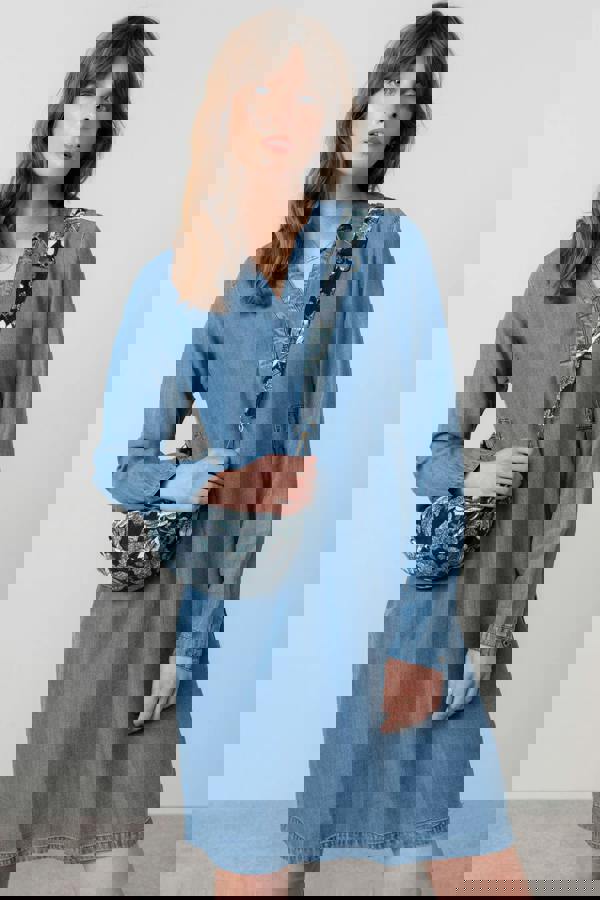 This easy wearing shift dress is made from soft, drapey Tencel™ denim. Panel detailing and pleating at the side waist creates a flattering silhouette. With a collared v-neckline, long sleeves and side pockets.