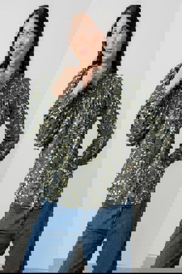 Long sleeves are shaped with a subtle blouson effect, gathered at the shoulders and cuffs. The Harvest Flower print uses bold mono blooms drawn to echo lino print making, giving the blouse a distinctive look for everyday wear.