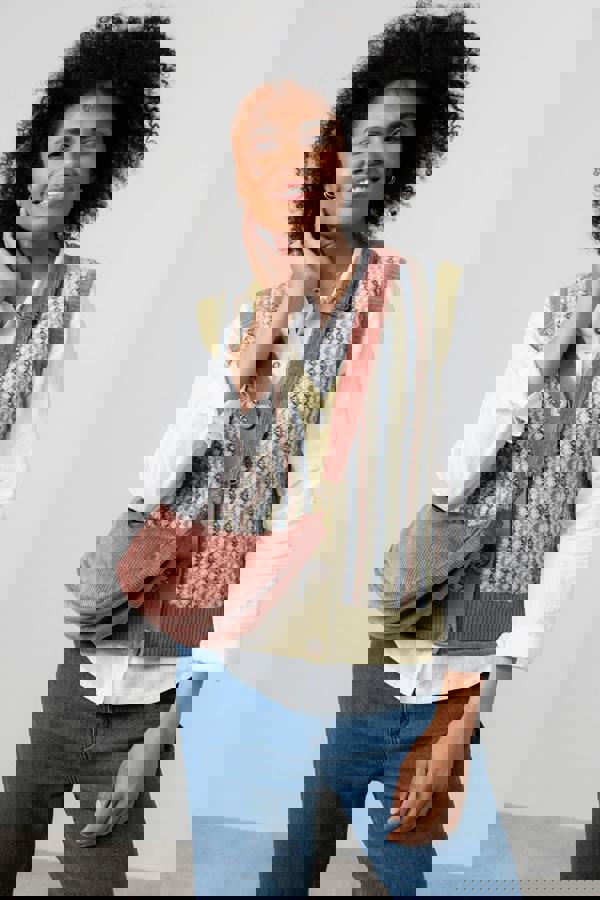 Soft textured jumbo cord fabric with a zip fastening and finished with an adjustable strap and antique brass fixings.
