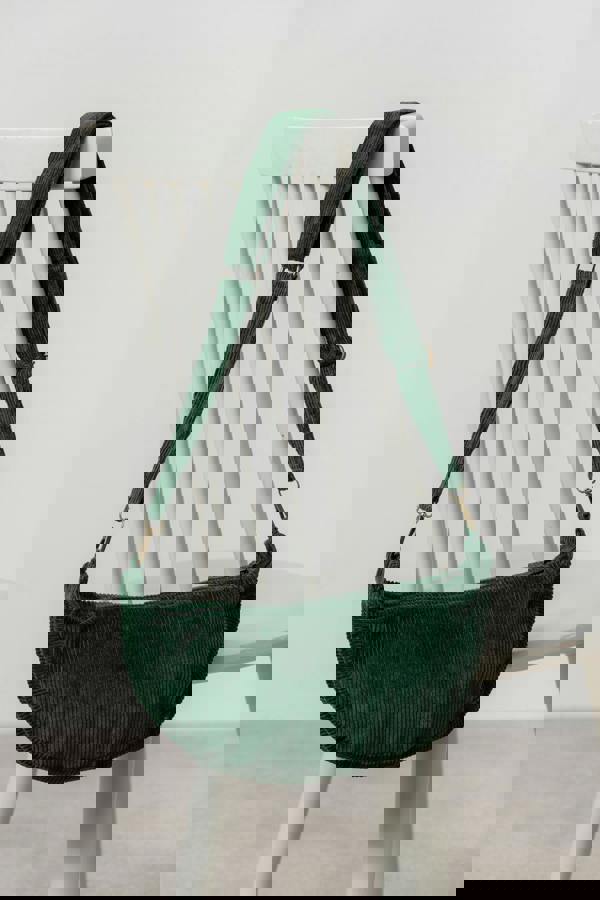 Soft textured jumbo cord fabric with a zip fastening and finished with an adjustable strap and antique brass fixings.