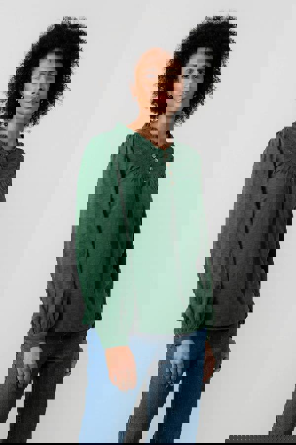 Cut in organic cotton jersey, the Lily & Me Luna Organic Cotton blouse returns for the season with considered detailing. A scalloped mandarin collar frames the neckline, finished with cotton lace trim and fastened with mock horn buttons. Gathering over the bust adds gentle shape, while the sleeve head is softly gathered for a relaxed silhouette.