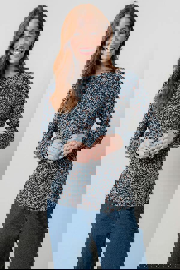 Cut in a soft, stretch jersey, the Lily & Me Monica Jersey Printed Top brings pattern to everyday dressing. This long-sleeved style is finished with a boat neck and the Moondream print, a floral take on animal with layered stamps and mark-making shapes set over a two-colour background.