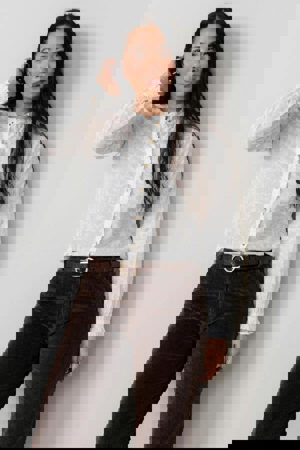 Intricate stitchwork brings a refined finish to the Lily & Me Rachel Embroidered Cotton Blouse, a white cotton style with considered detailing. Cut in embroidered woven cotton, it pairs a clean, geometric pattern with delicate floral stitching, drawing on the look of French knot hand embroidery. A full button-down front keeps the silhouette classic, while gentle gathering at the back yoke adds subtle shape.