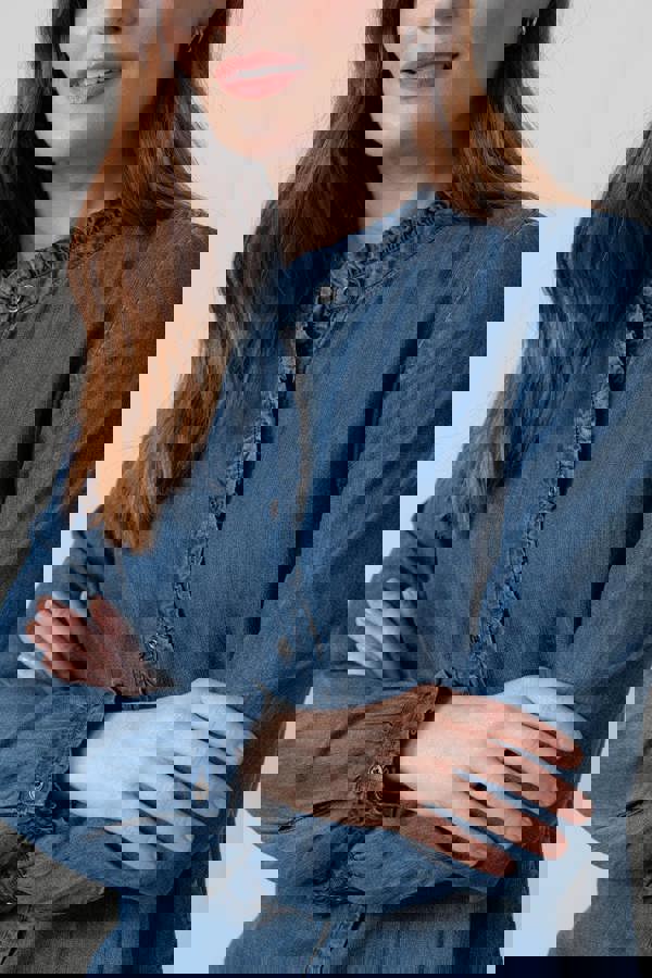 Soft, drapey Tencel™ denim brings a refined feel to the Lily & Me Rachel Tencel™ Denim Frill Blouse, finished in blue. Feminine detailing runs through the design, from the scalloped mandarin collar to the matching scallop trim at the neckline, cuffs and long sleeves. A half frill sits along the button placket, while gentle gathering at the back yoke seam adds subtle shape.