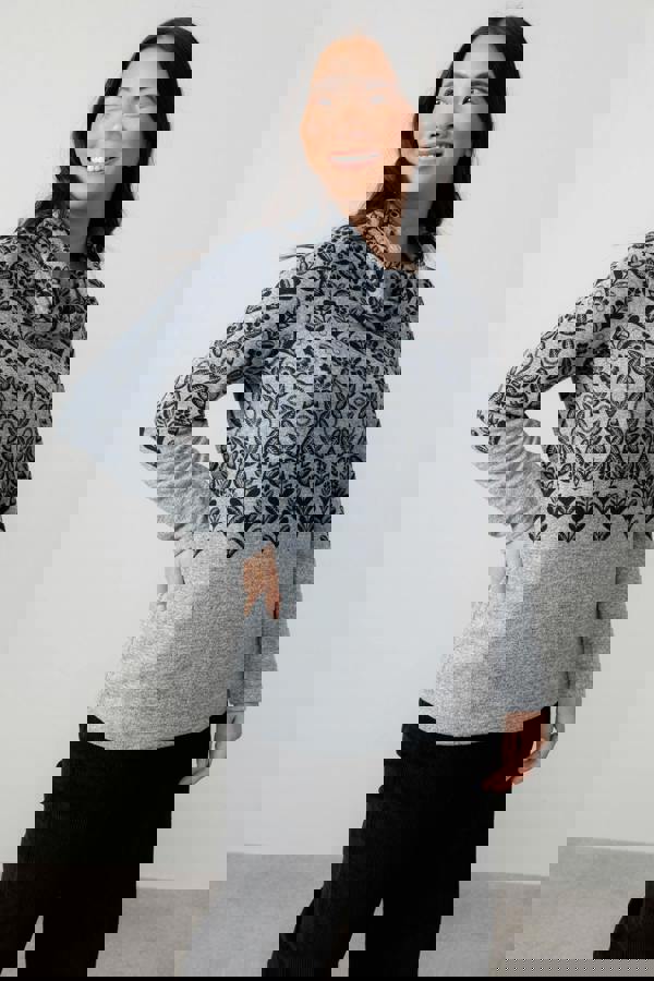 This super soft cowl neck jumper is a Lily & Me best seller. Made from recycled brushed polyester for a warm hand-feel and a touch of elastane to give stretch. Featuring a bold mono, inspired by a blend of Fair Isle and traditional folk print.