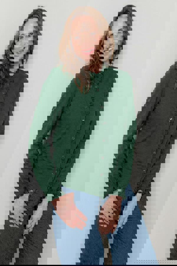 Soft texture and delicate detailing define the Lily & Me Sage Frill Organic Cotton Blouse. Cut from organic cotton slub jersey, it brings a breathable feel to everyday dressing while keeping the finish refined. Broiderie trim shapes a scalloped neckline and continues along the button placket and cuffs, giving the blouse a distinctive, feminine edge.