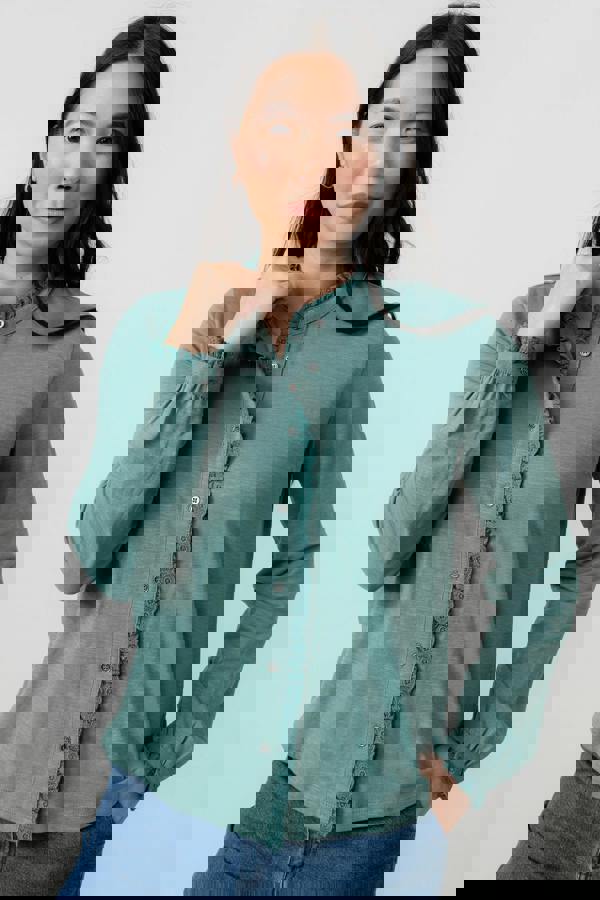 Soft texture and delicate detailing define the Lily & Me Sage Frill Organic Cotton Blouse in Sea Mist. Cut from organic cotton slub jersey, it brings a gentle handle and an easy-care finish to everyday dressing. Broderie trim frames the scalloped neckline and continues through the button placket, with matching detail at the cuffs for a refined, feminine look.