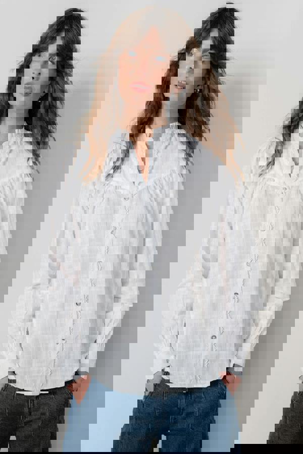 Cut in textured check woven organic cotton, Lily & Me’s Wayfaring blouse brings a soft, detailed finish to everyday dressing. The relaxed shape is framed by a frilled mandarin collar with a scalloped edge and a neat v-neckline, while gathers at the front and back yoke seams add gentle definition through the body.