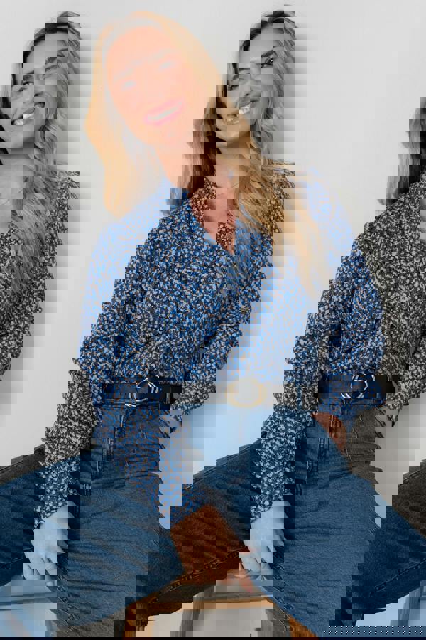 Pattern and texture take focus in the Lily & Me Wayfaring blouse, finished in the Alicia print in cobalt. Cut from organic cotton jersey, it brings a soft, breathable handle to everyday dressing, with a full button-down front that works neatly for layering or wearing on its own. A scalloped mandarin collar adds a refined edge, while the front yoke seam with delicate gathering introduces gentle shape through the body.