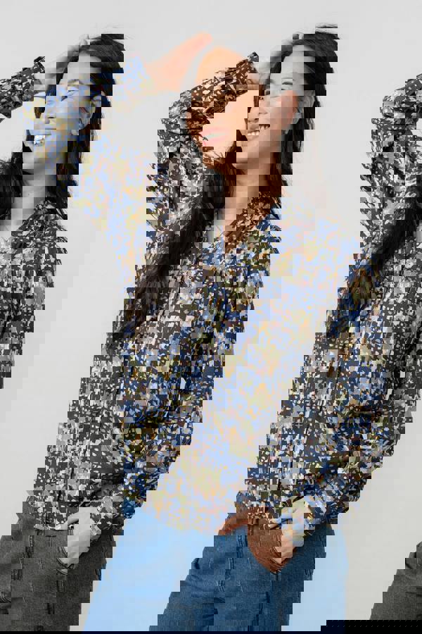 A relaxed silhouette with refined detailing, the Lily & Me Wayfaring Frill Neck Blouse is a woven style in navy Clover print. The frilled mandarin collar and V-neckline create a clean, feminine finish, while gathers through the front and back yoke seams add soft shape without structure.