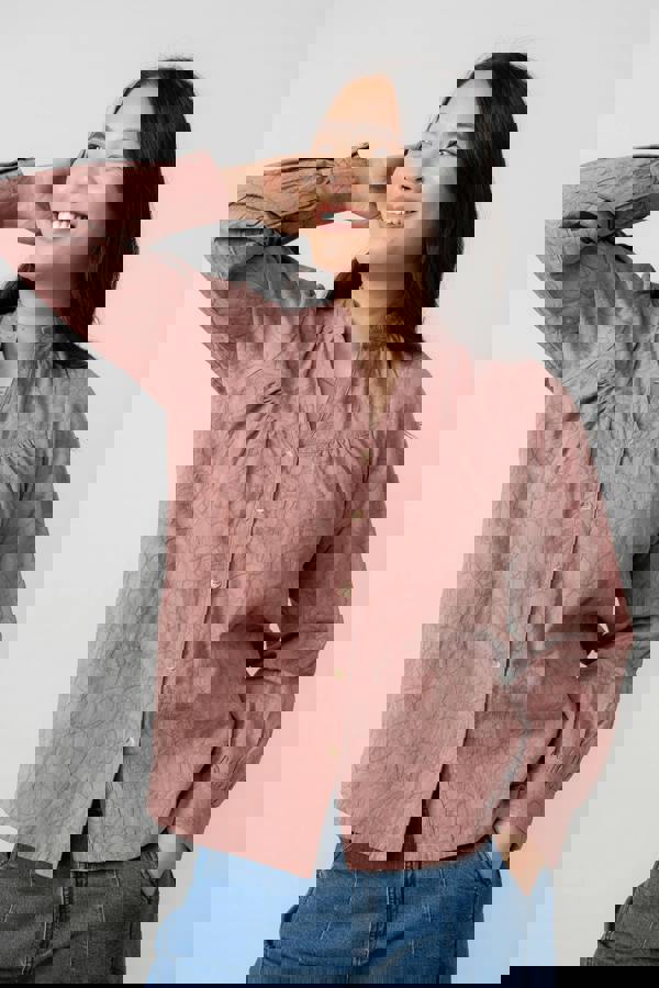 Gathering through the front and back yoke seams adds gentle volume, while long sleeves with buttoned cuffs keep the silhouette neat. A full button-down front makes it easy to wear on its own or layered with other pieces. This style comes in Antique Rose.