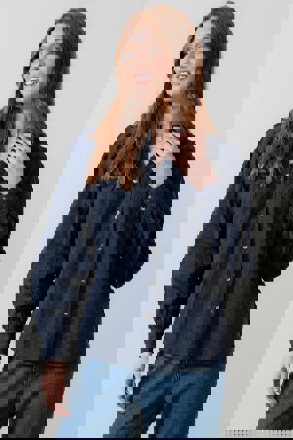 Cut with a relaxed silhouette, the Lily & Me Wayfaring blouse brings a refined finish to everyday dressing. This women’s shirt comes in navy with a textured woven jacquard floral design, adding subtle depth to the look. A scalloped, frilled mandarin collar and v-neckline frame the face neatly, while gathers through the front and back yoke seams create gentle shape without feeling restrictive.