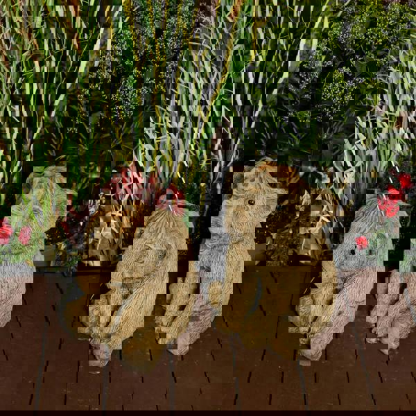 Meanwhile, the baby mammoth on the right lies down, gazing forward with a calm expression. The contrast between their grey stone texture and the vibrant green ivy leaves creates an eye-catching display.