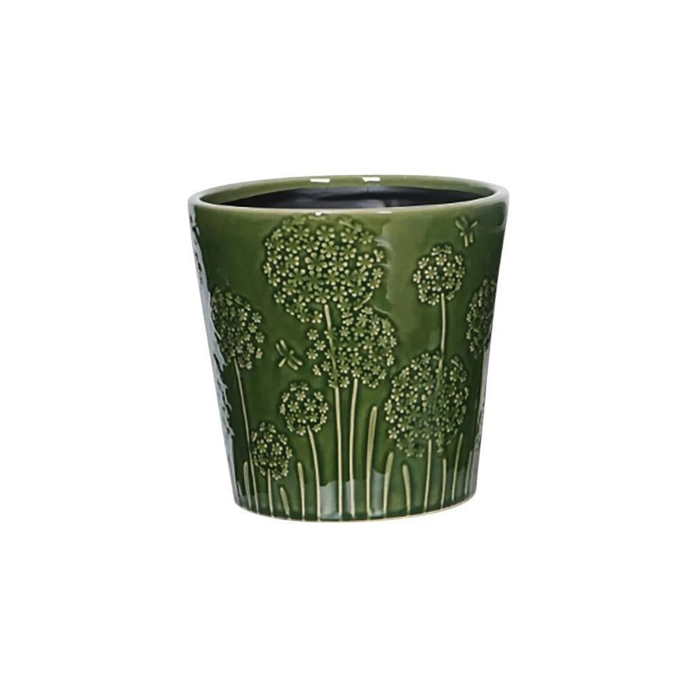 Bring the whimsical charm of a British summer meadow into your home with this exquisite ceramic planter. Finished in a rich, verdant green glaze, this pot is adorned with a beautifully intricate embossed pattern. Delicate wildflower seed heads, reminiscent of alliums, stand tall alongside charming dragonfly motifs, creating a piece that is not just a planter, but a celebration of nature itself. Simply place your favourite houseplant in its nursery pot directly inside for an instant and elegant upgrade. It's the perfect home for your foliage, blending artistic detail with everyday functionality. Plant not included.