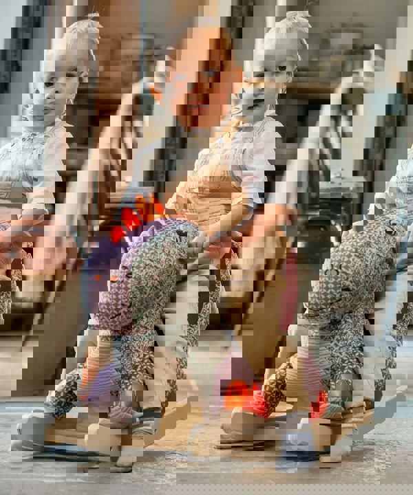Digley is more than just a rocking dinosaur. He’s designed for comfort, safety, and sensory fun. His softly padded body makes him the perfect huggable dinosaur plush toy. A sturdy wooden frame ensures gentle, secure rocking. Crinkle fabric fronds add sound and texture for extra sensory play. The supportive seat, finished with an attractive diamond stitch design, keeps young riders snug and confident.