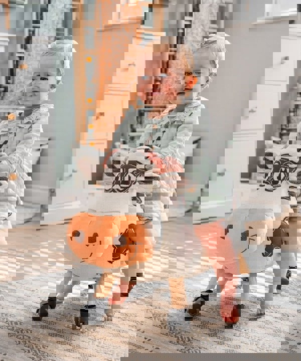 With his supportive curved padded seat and multi directional castors, Moobert offers a fun and friendly ride! He features super soft fabrics, fun crinkles and a stylised leatherette seat. A solid wooden frame and softly padded body makes Moobert both sturdy and huggable.