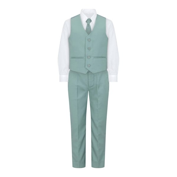 Crafted from a luxurious soft sage green fabric, this outfit includes a jacket, waistcoat, trousers, a crisp white shirt, and a matching sage tie, creating a cohesive and polished look that exudes charm and elegance.