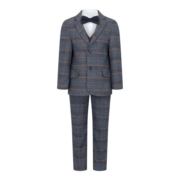 Introducing the stunning 5-piece suit that is perfect for any formal event! Prepare to turn heads with its striking blue and orange check design.