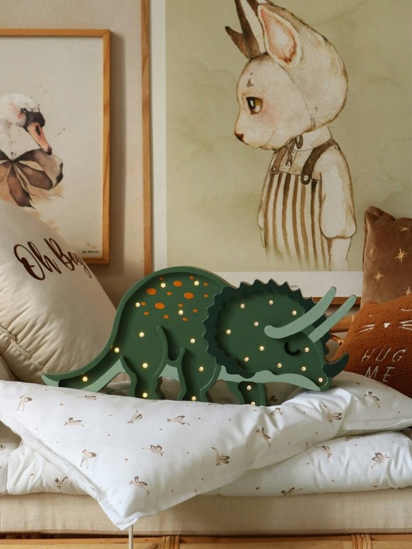 The Little Lights Dino Triceratops Lamp in Green (20.5x43.5x5.5 cm) is a characterful lighting piece designed to bring a gentle glow to a child’s room. Shaped like a triceratops, it adds a playful decorative touch while helping to create a calmer atmosphere at bedtime.