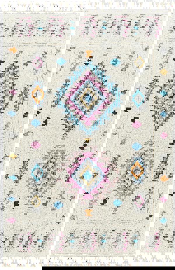 Livabliss Lofty-Shaggy Ivory Pink Blue Vintage Boho Plush Soft Pile Fringe Rug