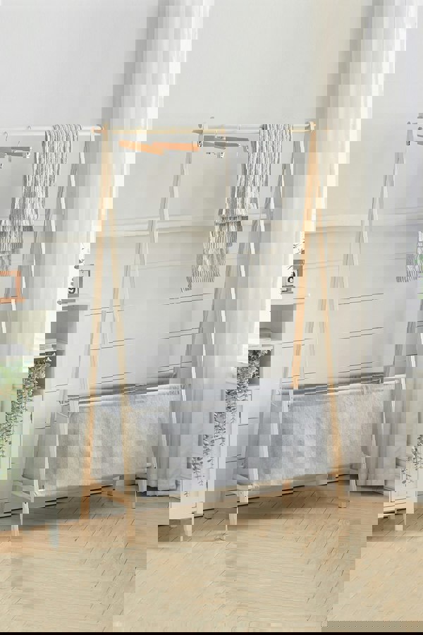 Standing wood coat rack with a big clothes storage bag allows various storage options. Easy to place in any corner of your bedrooms, entryway and much more! The A shaped design ensure strong stability to this clothing rack for stability that supports multiple heavy garments and outerwear. It looks natural and decent,goes well with the home.