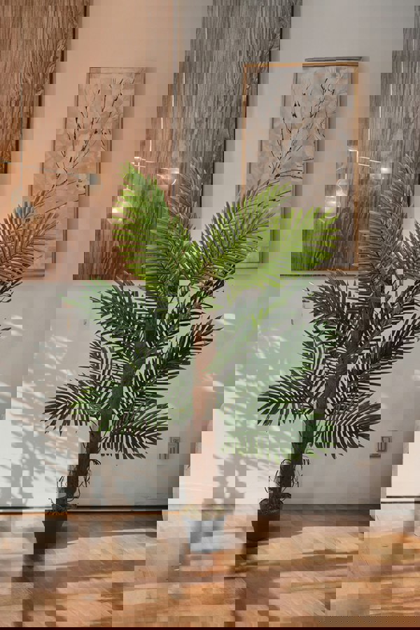 Add a touch of the elegance of greenery to your space with the artificial potted plant! It perfectly captures the delicate textures and vibrant green hues of real palm foliage. Unlike flat and lifeless artificial plants, this palm tree boasts a natural layering effect. The plastic tree trunk features a real wood grain texture and a more natural silhouette, providing a dynamic and eye-catching aesthetic. A base consists of a sturdy plastic pot filled with solid cement, providing excellent stability to keep the tree securely in place. Whether displayed in a corner or as part of a larger arrangement, it adds dimension and depth to your home or office décor.