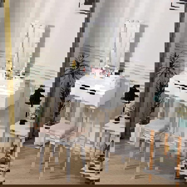 Start your daily beauty routine with this modern and stylish vanity set. Crafted from durable MDF, this dressing table boasts a compact yet stable structure that is easy to assemble. Featuring four easy-to-open drawers and multiple open storage compartments of various sizes on the tabletop, it offers a complete storage solution for all your cosmetics. Introduce it to your room to keep your makeup neatly organized while enhancing your routines with style and ease.