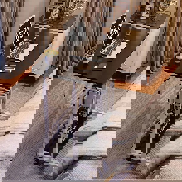 To enhance your work experience, this mobile table offers both comfort and functionality. This mobile table is carefully crafted from MDF and metal materials to ensure stability and sturdiness. The convenient knobs allow for easy adjustment of the table height, ensuring a comfortable user experience. Plus, the storage shelf at the bottom provides extra space to store books or other items, keeping your desktop neat and organized. With its modern minimalist style, this table seamlessly blends with various home environments.