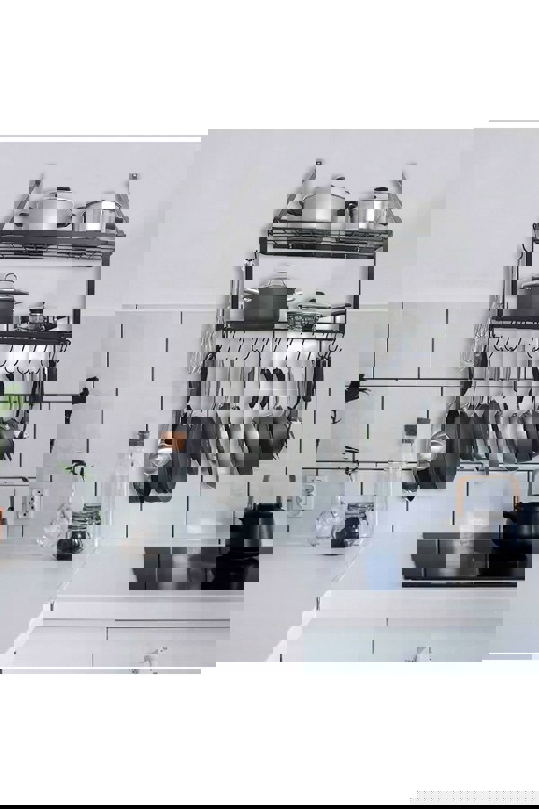 This pot rack will be the perfect addition to kitchens or places where storage space is limited. Made from high-quality metal material, our pot rack is built with a sturdy and durable construction to hold large pots and other kitchen essentials. This stylish metal kitchen pot rack storage keeps everything within reach and is an organized way to store pans, spice jars and baking sheets. Even better, it expands the storage space with 10 detachable hooks with which you can hang pots and pans.