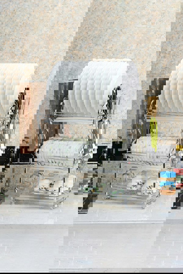 This is our 3-layer chrome plated tableware drainer, which is perfect for draining and drying tableware effectively. The design looks modern and elegant.