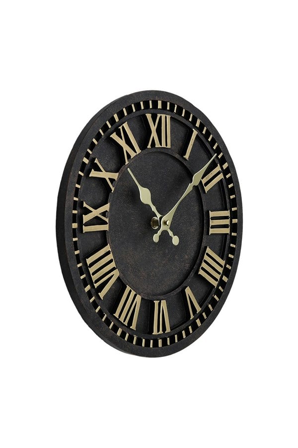 Crafted with resin, this clock features a rich black and gold finish that adds class to any room.