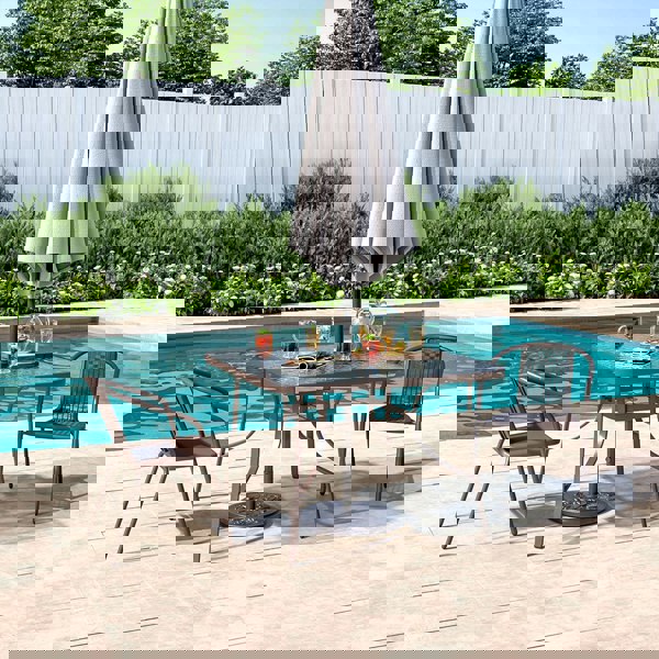 This garden patio dining set offers a simple, elegant look for outdoor dining at home or in a commercial setting. Designed for patio and poolside use, it creates a practical space for serving drinks, sharing meals or setting out menus in an outdoor bar or dining area.